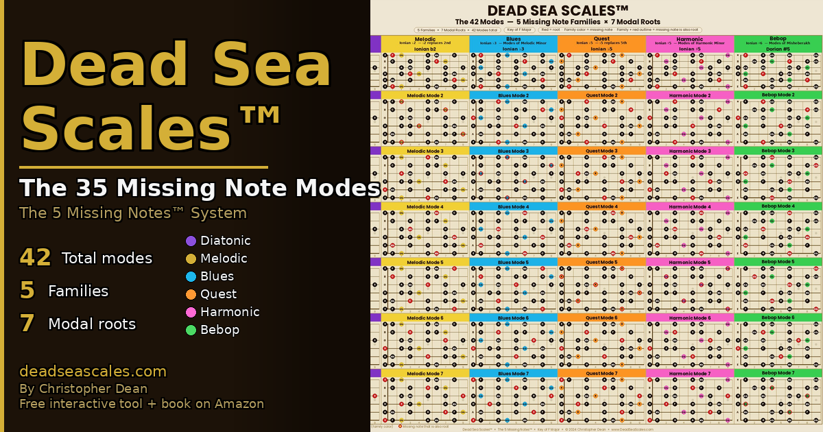 That's the Dead Sea Scales discovery: you don't need to memorize 42 separate scales. You already know the 7 diatonic shapes — now just swap one interval at a time. Each of the 5 missing notes transforms all 7 diatonic modes, giving you 5 × 7 = 35 new modes, for a total of 42 modes from just 7 shapes.